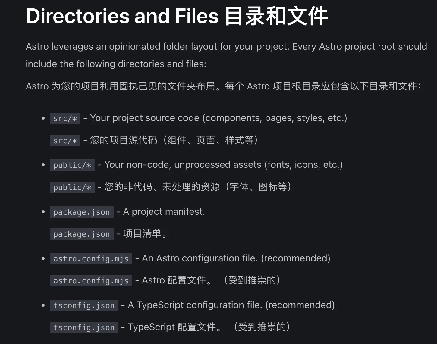 .├── public(静态资源)├── src(源代码所在位置)│ ├── components(可重用代码单元,组件)│ ├── layouts(布局组件)│ ├── pages(用于创建新页面,可以是astro组件也可以是md文件)│ │ └── posts│ ├── styles(样式)│ └── content(用于存储内容集合和可选的集合配置文件)├── astro.config.mjs(Astro 项目的配置文件)├── package.json(js包管理器用来管理依赖项的文件)└── tsconfig.json(Astro 项目的 TypeScript 配置选项)