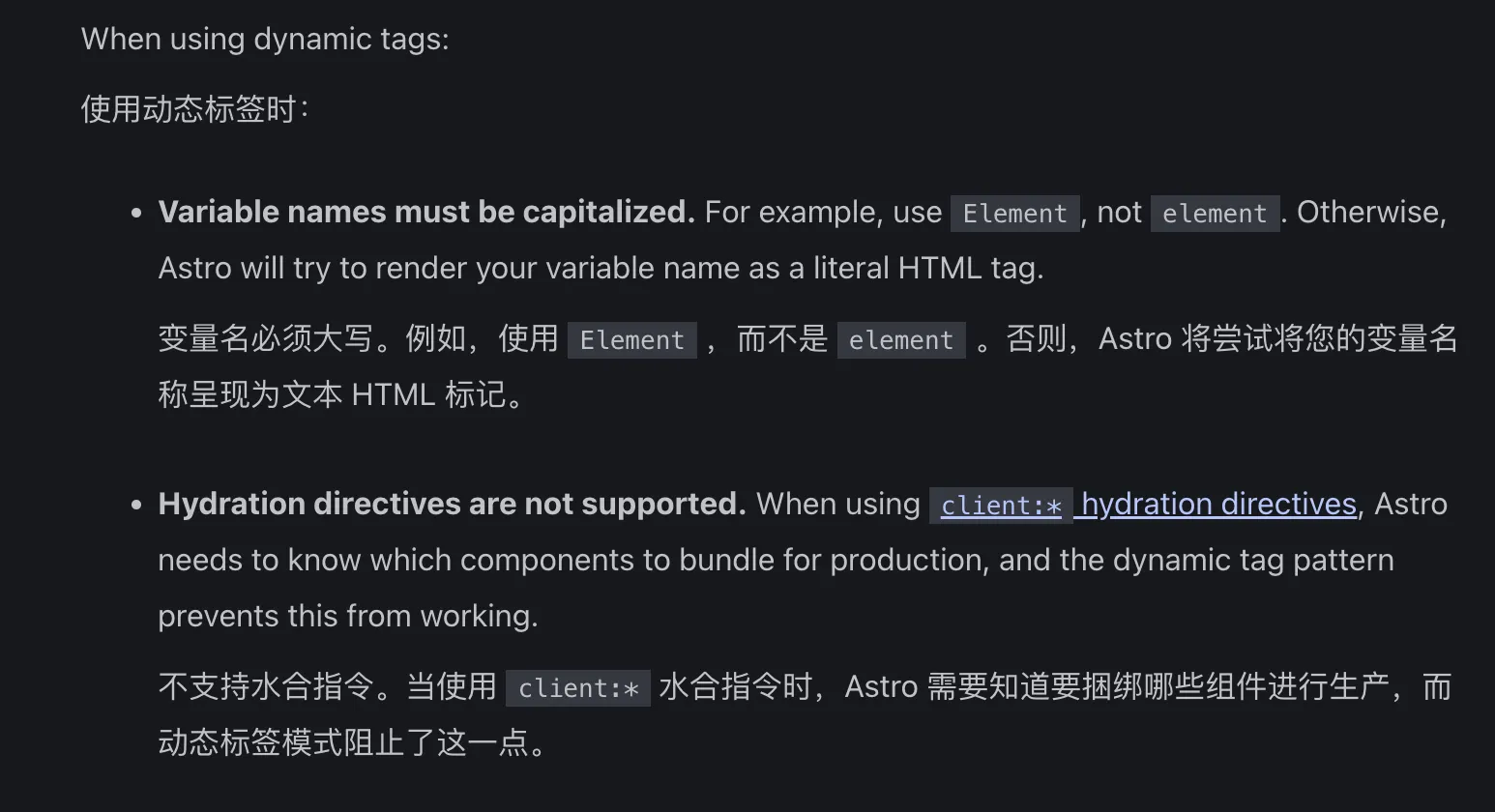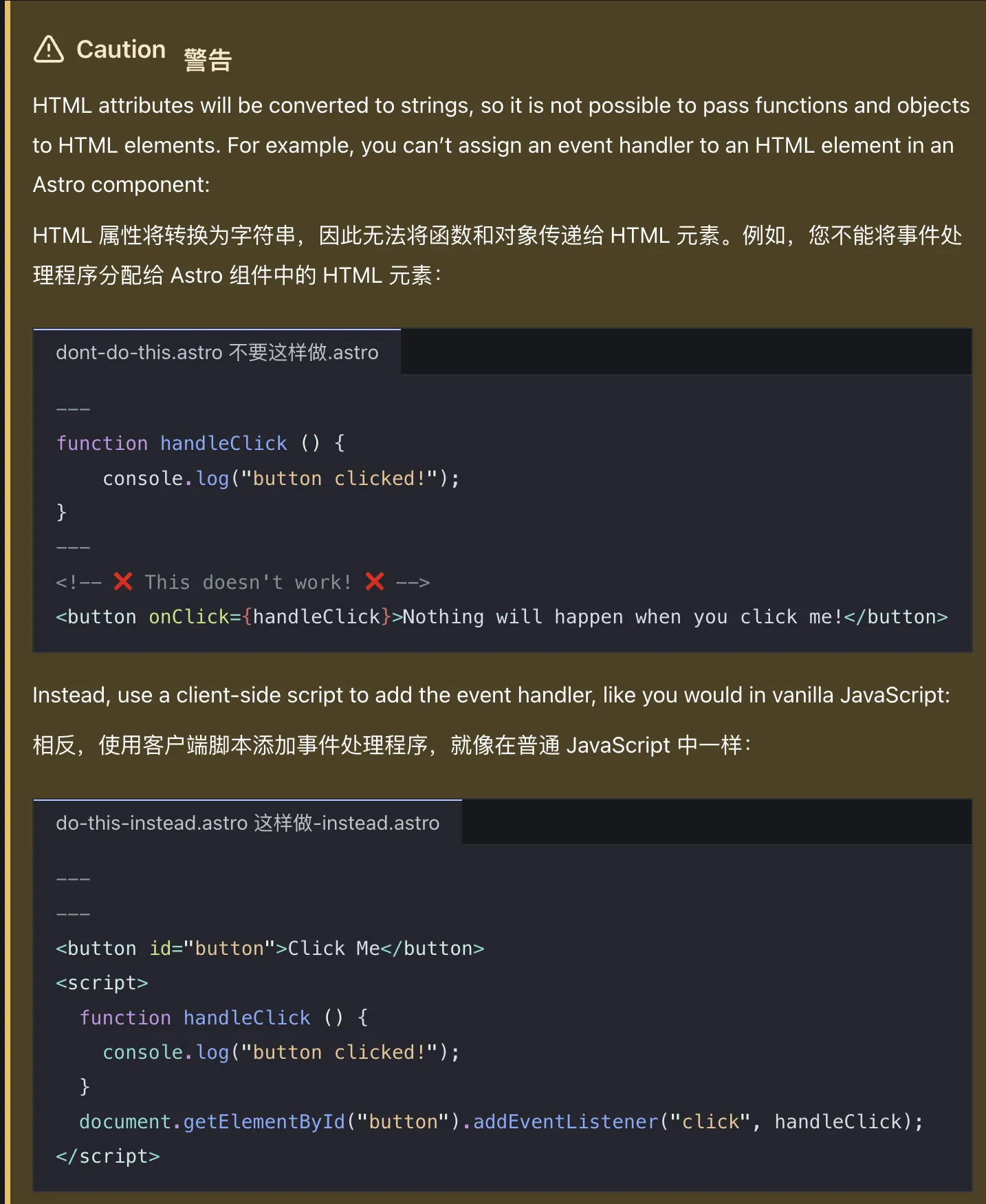 然而,在Astro中,所有的HTML属性都使用短横线分隔命名法(kebab-case)。也就是说,我们会使用tab-index而不是tabIndex。这种命名法甚至适用于class属性,这在React中是不支持的(在React中,我们通常使用className而不是class)。