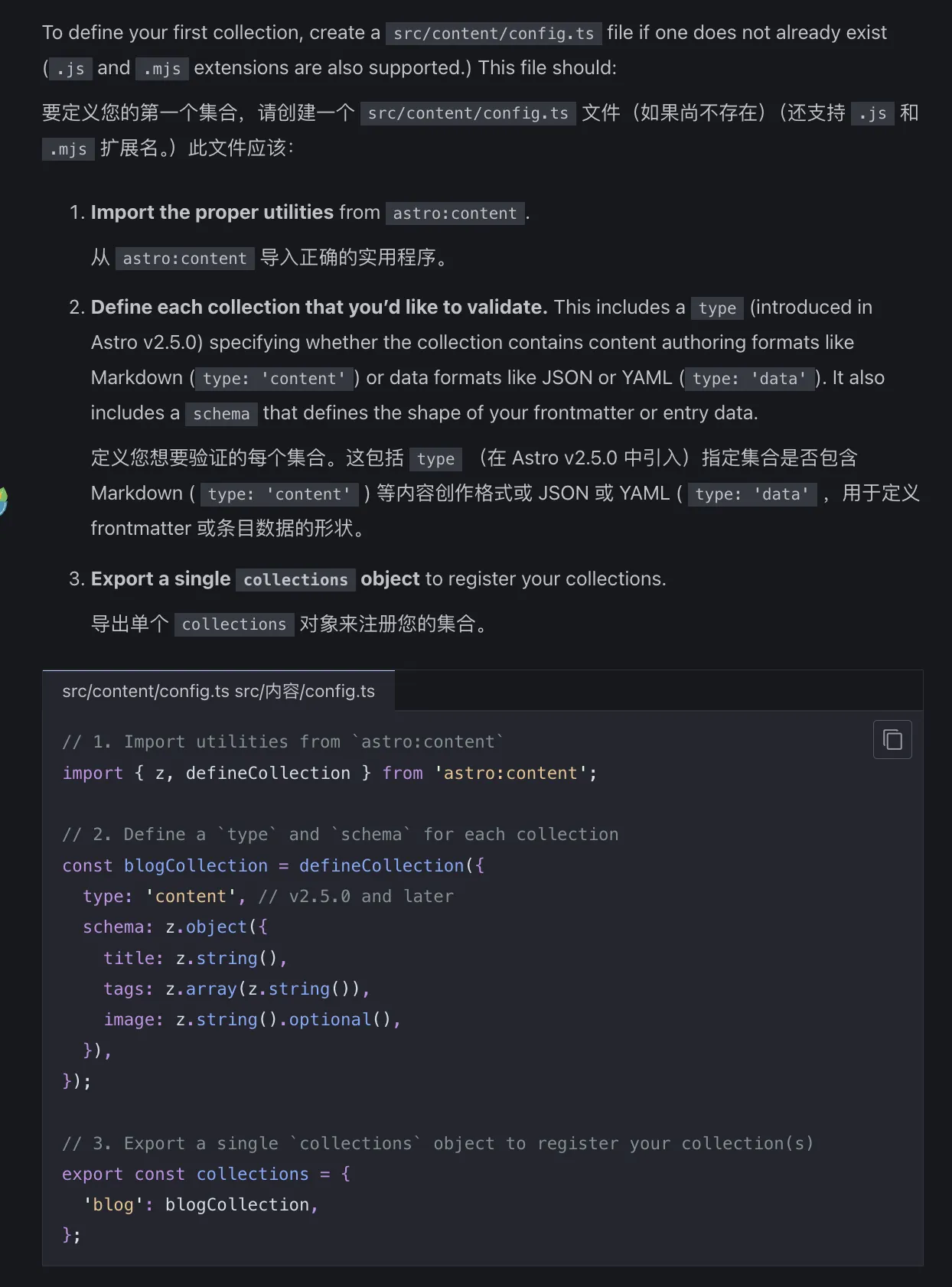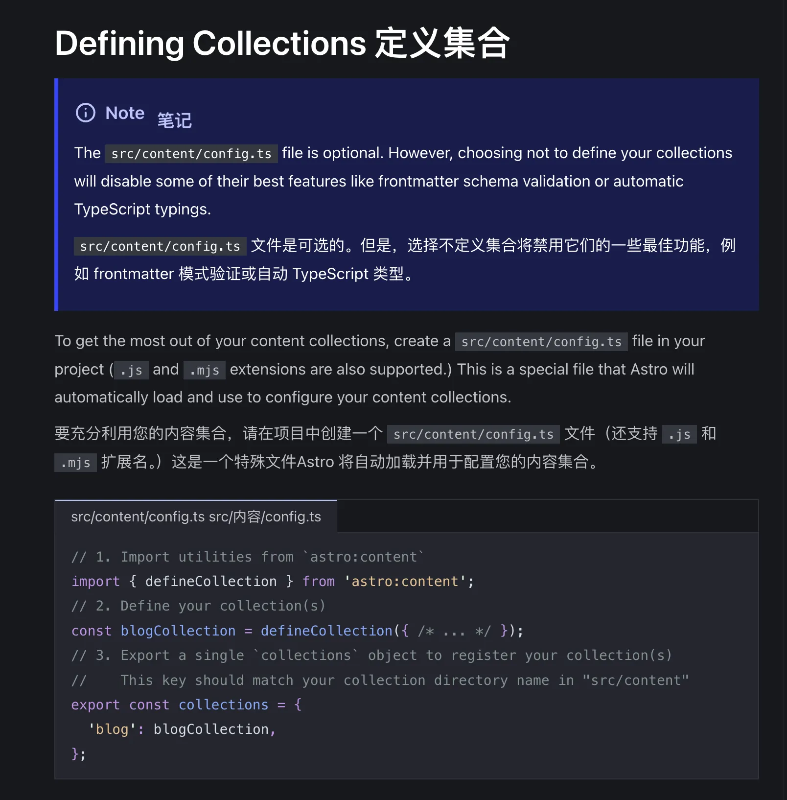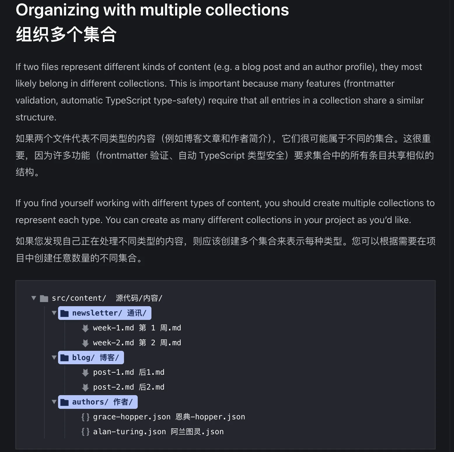 1、内容集合是在任何 Astro 项目中管理和创作内容的最佳方式。集合有助于组织文档、验证 frontmatter 并为所有内容提供自动 TypeScript 类型安全。