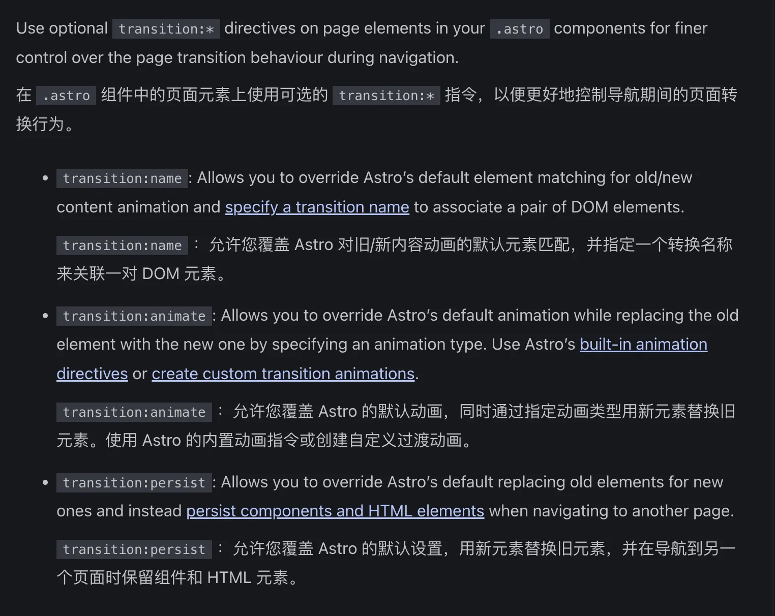 astro组件使用可选的transition:*指令