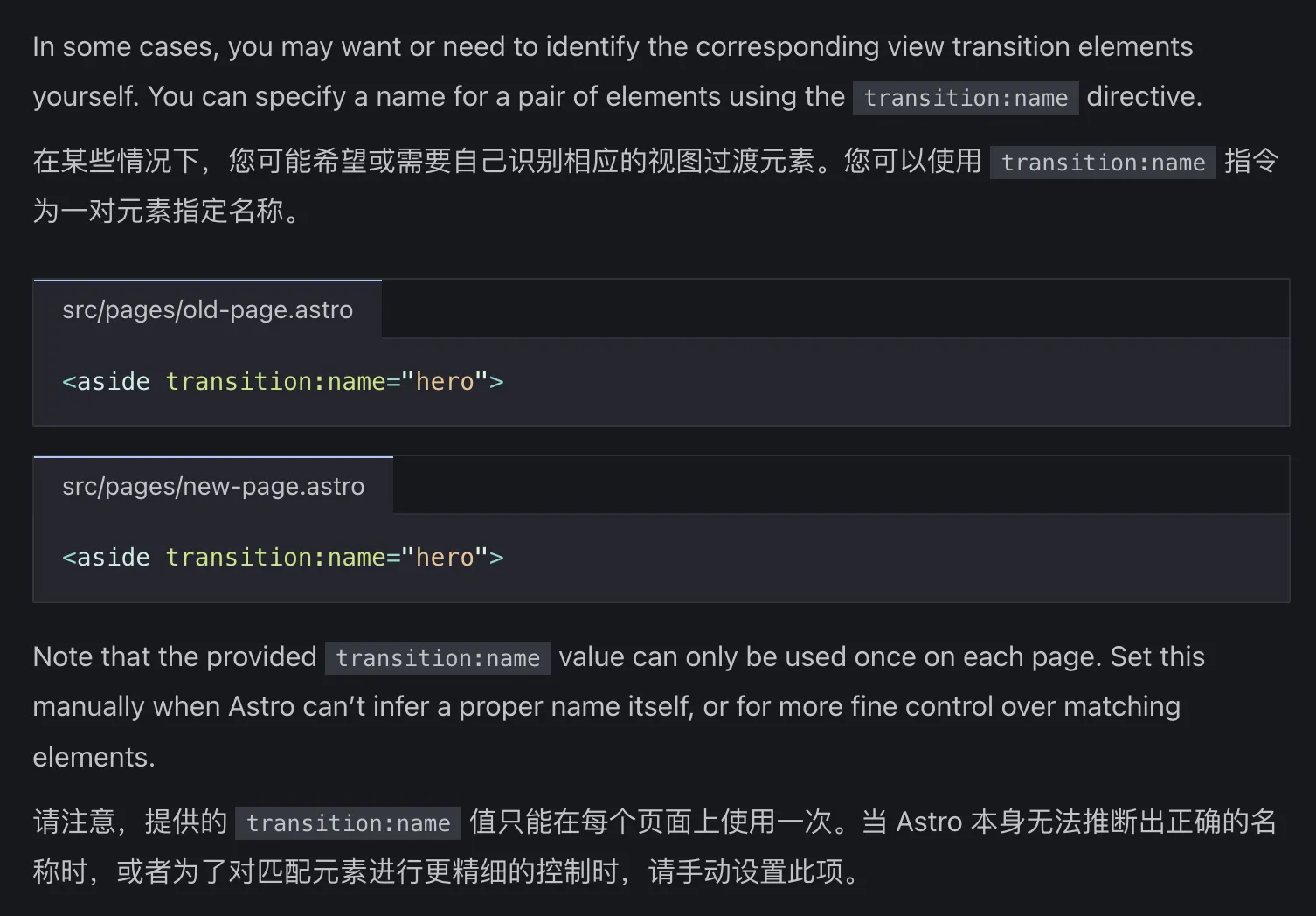 Astro 会自动为旧页面和新页面中找到的相应元素分配一个共享的、唯一的 view-transition-name 。这对匹配元素是通过元素的类型及其在 DOM 中的位置来推断的。