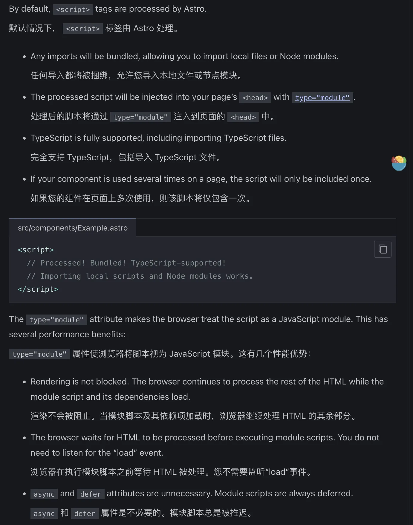5、在某些情况下,Astro 不会处理您的脚本标签。特别是,将 type=“module” 或 src 之外的任何属性添加到 <script> 标记将导致 Astro 将该标记视为具有 is:inline