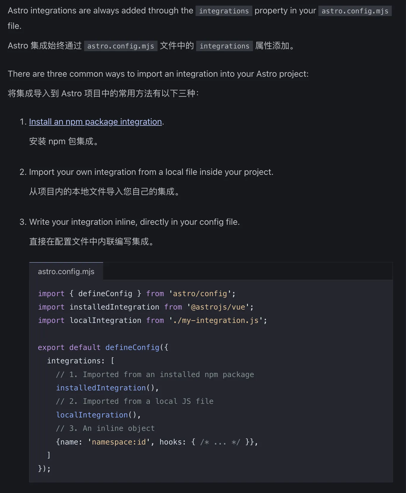 如果您在添加集成后看到任何类似 Cannot find package ‘[package-name]’ 的警告,则您的包管理器可能尚未为您安装对等依赖项。要安装这些缺少的软件包,请运行 npm install [package-name] 。