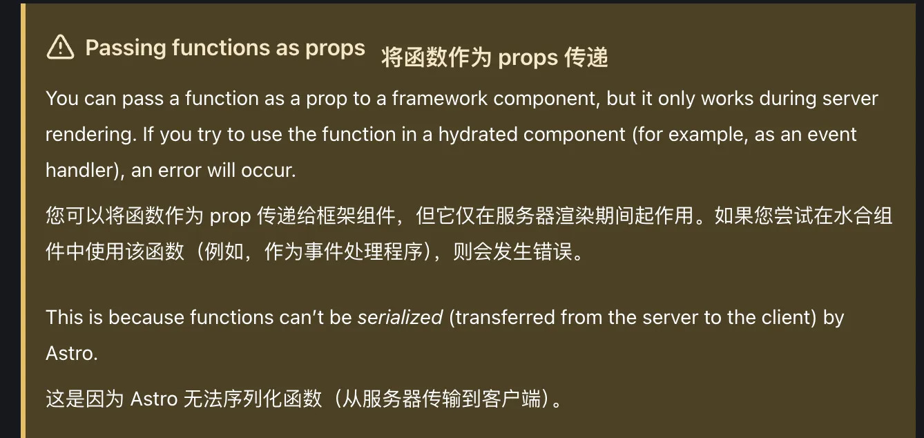 12、Astro 组件始终呈现为静态 HTML,即使它们包含水合的框架组件也是如此。这意味着您只能传递不执行任何 HTML 渲染的 props。将 React 的“渲染属性”从 Astro 组件传递到框架组件将不起作用,因为 Astro 组件无法提供此模式所需的客户端运行时行为。相反,请使用命名槽。