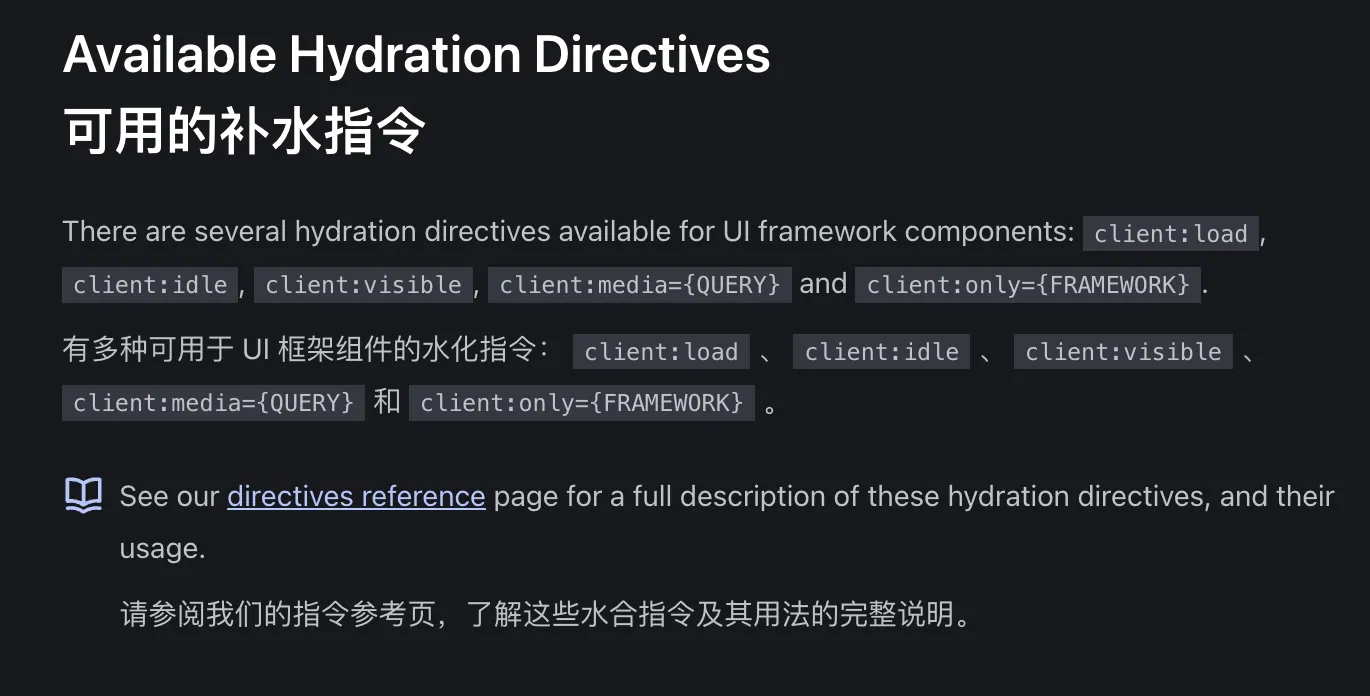 2、可以使用 client:* 指令使框架组件具有交互性(水合)。这些组件属性决定组件的 JavaScript 何时应发送到浏览器。